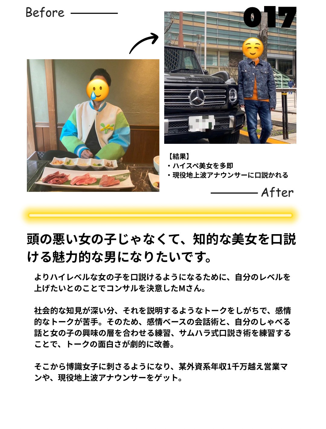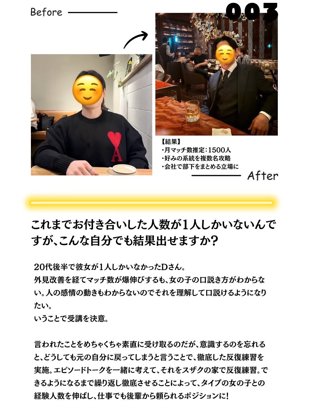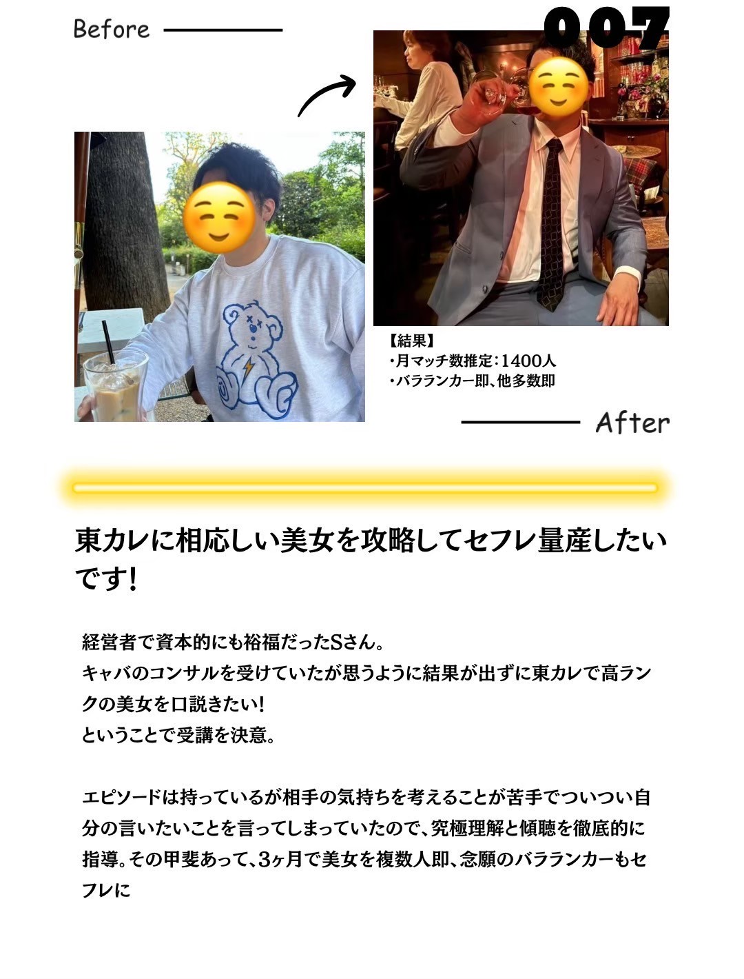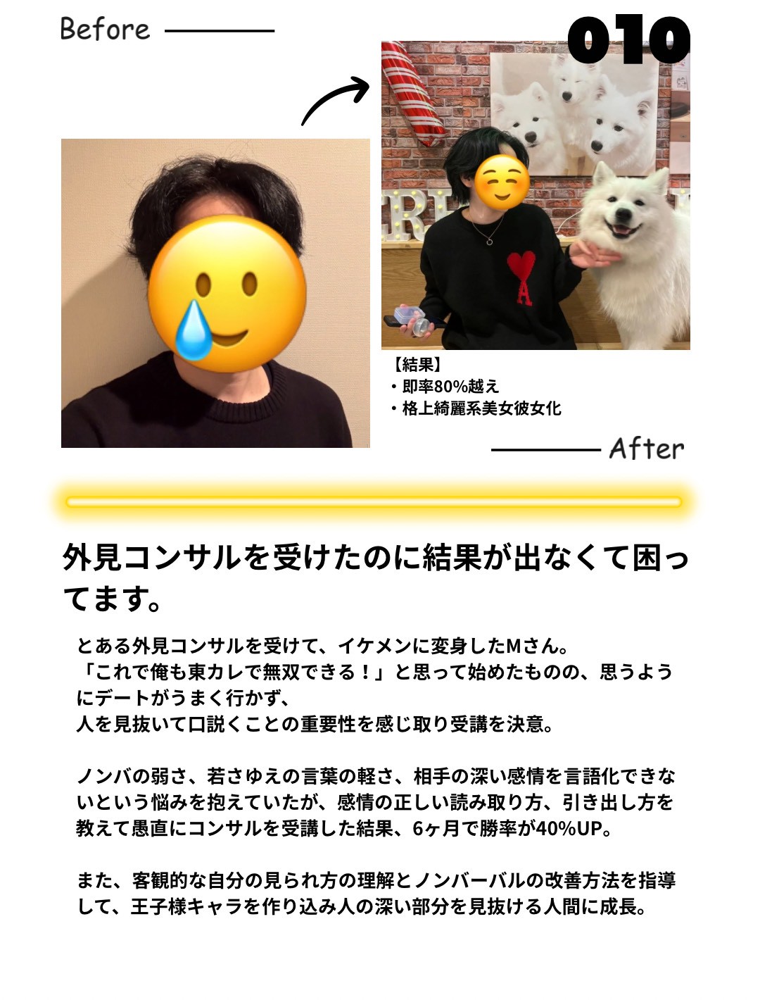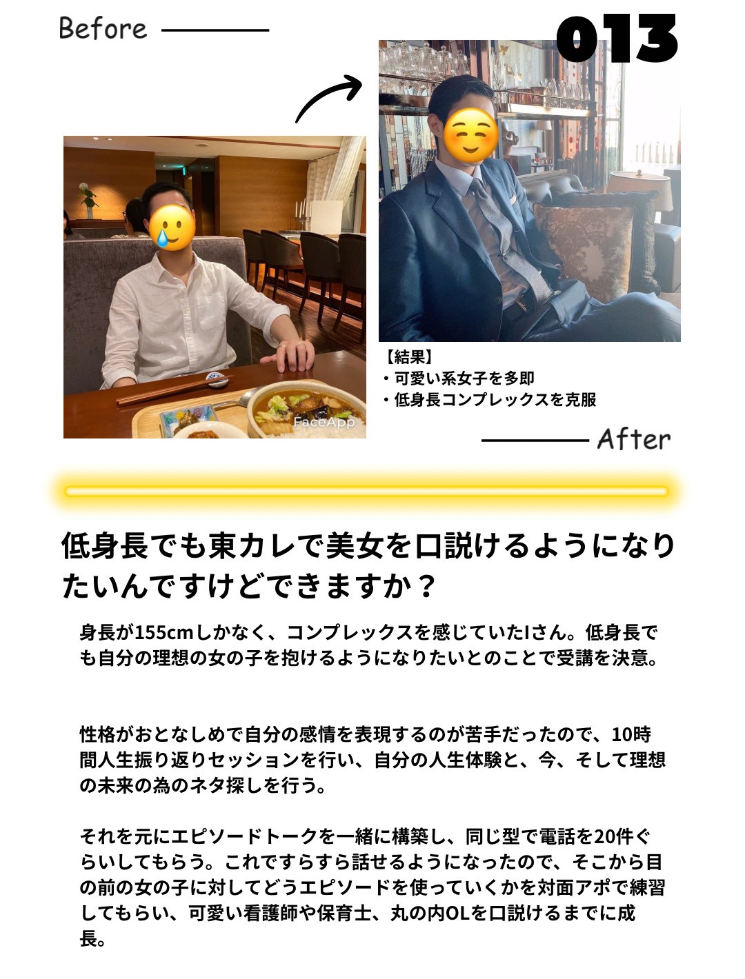 話しすぎるくせについては、割と必要ない言葉で会話の隙間を埋めようとする癖があったので、心の内側から来ている問題だと推定。その根源を自覚させるとともに、女性を魅了するためのゴールまでに必要な会話を認識させ、それ以外の会話は必要ないと言う教育をした上で、電話にて実践練習。その振り返りを行った。最初のほうはどうしても喋りすぎていたため、電話アポにてとある方法を試したところ、自発的に会話の間を埋めようとする行動自体が少なくなり、落ち着きのあるノンバーバルに変化していった。