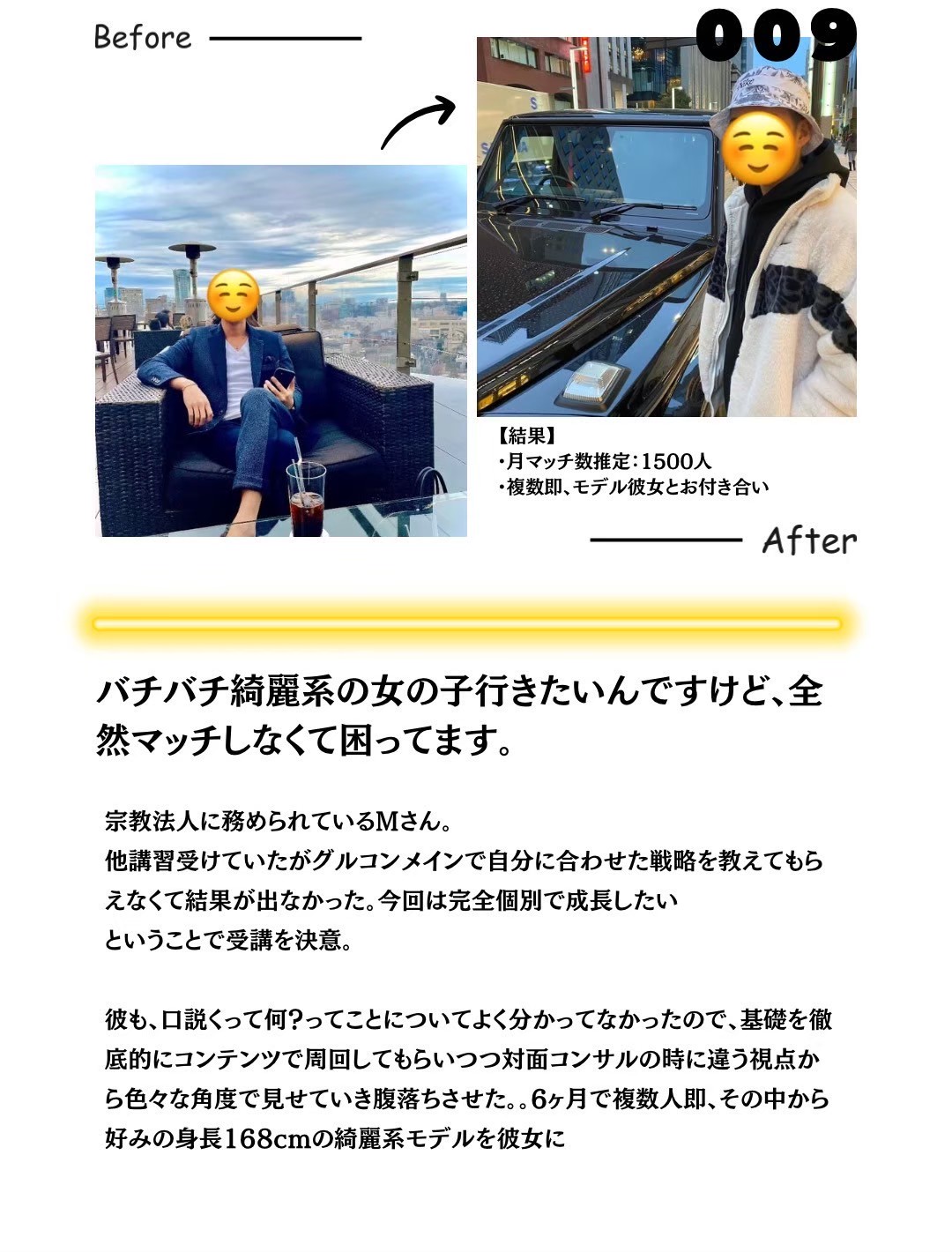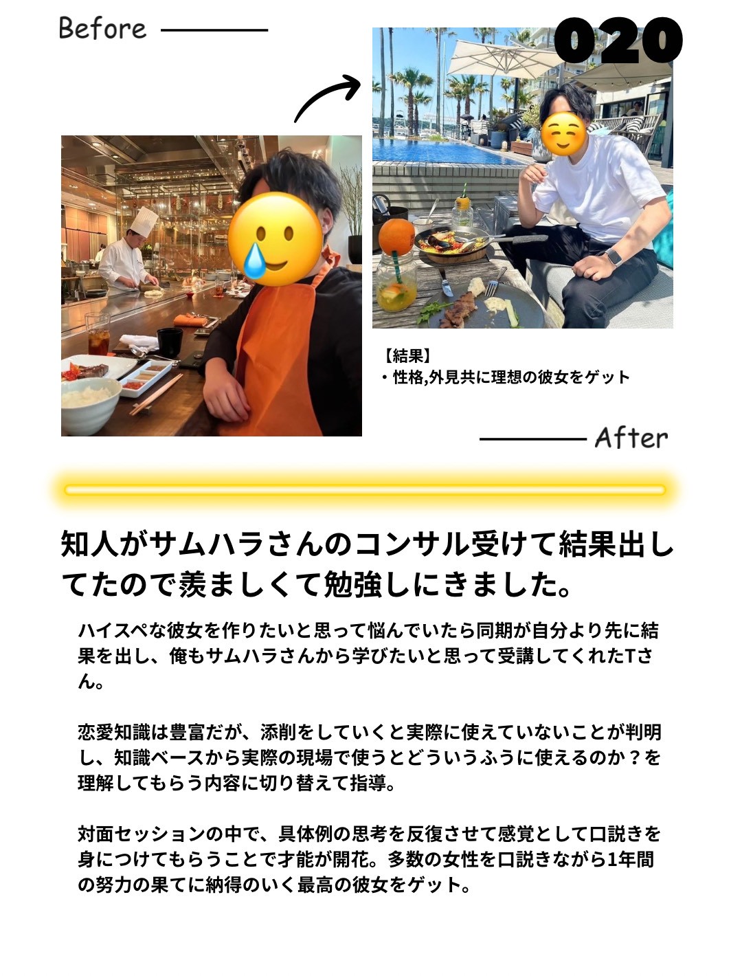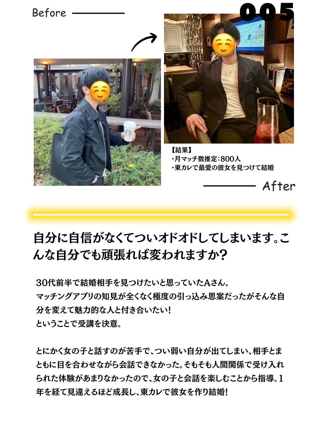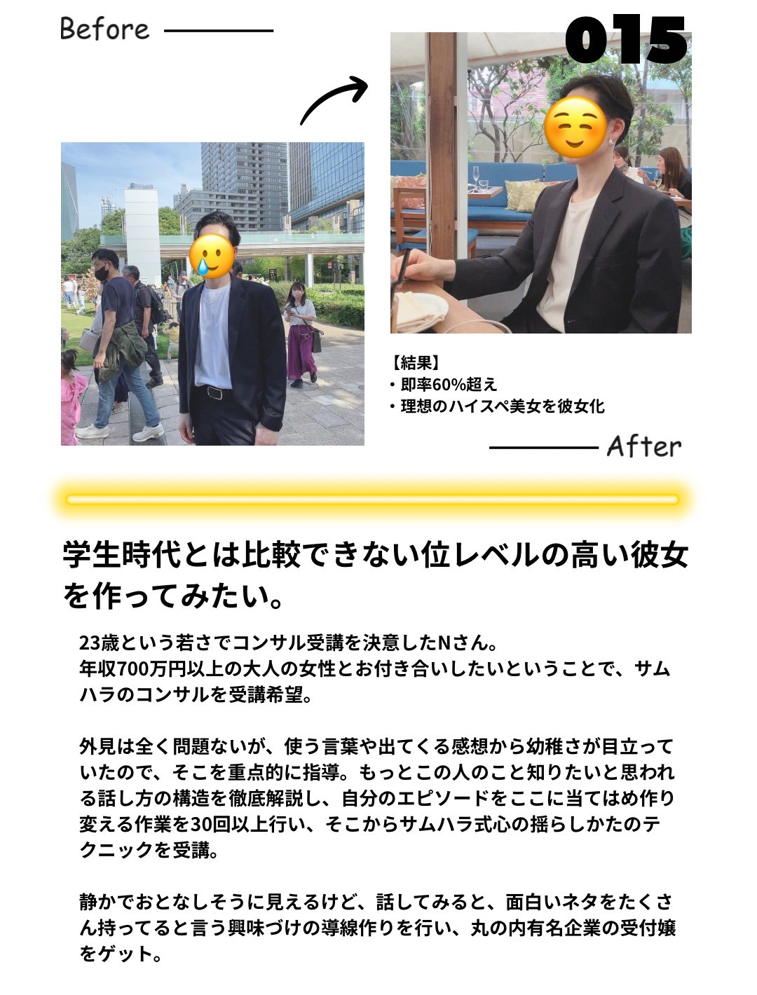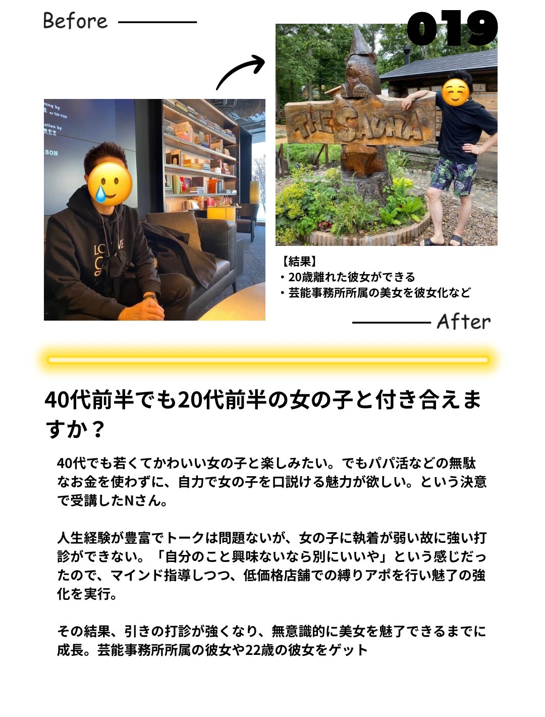 話しすぎるくせについては、割と必要ない言葉で会話の隙間を埋めようとする癖があったので、心の内側から来ている問題だと推定。その根源を自覚させるとともに、女性を魅了するためのゴールまでに必要な会話を認識させ、それ以外の会話は必要ないと言う教育をした上で、電話にて実践練習。その振り返りを行った。最初のほうはどうしても喋りすぎていたため、電話アポにてとある方法を試したところ、自発的に会話の間を埋めようとする行動自体が少なくなり、落ち着きのあるノンバーバルに変化していった。