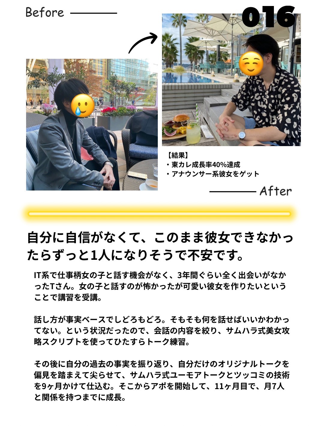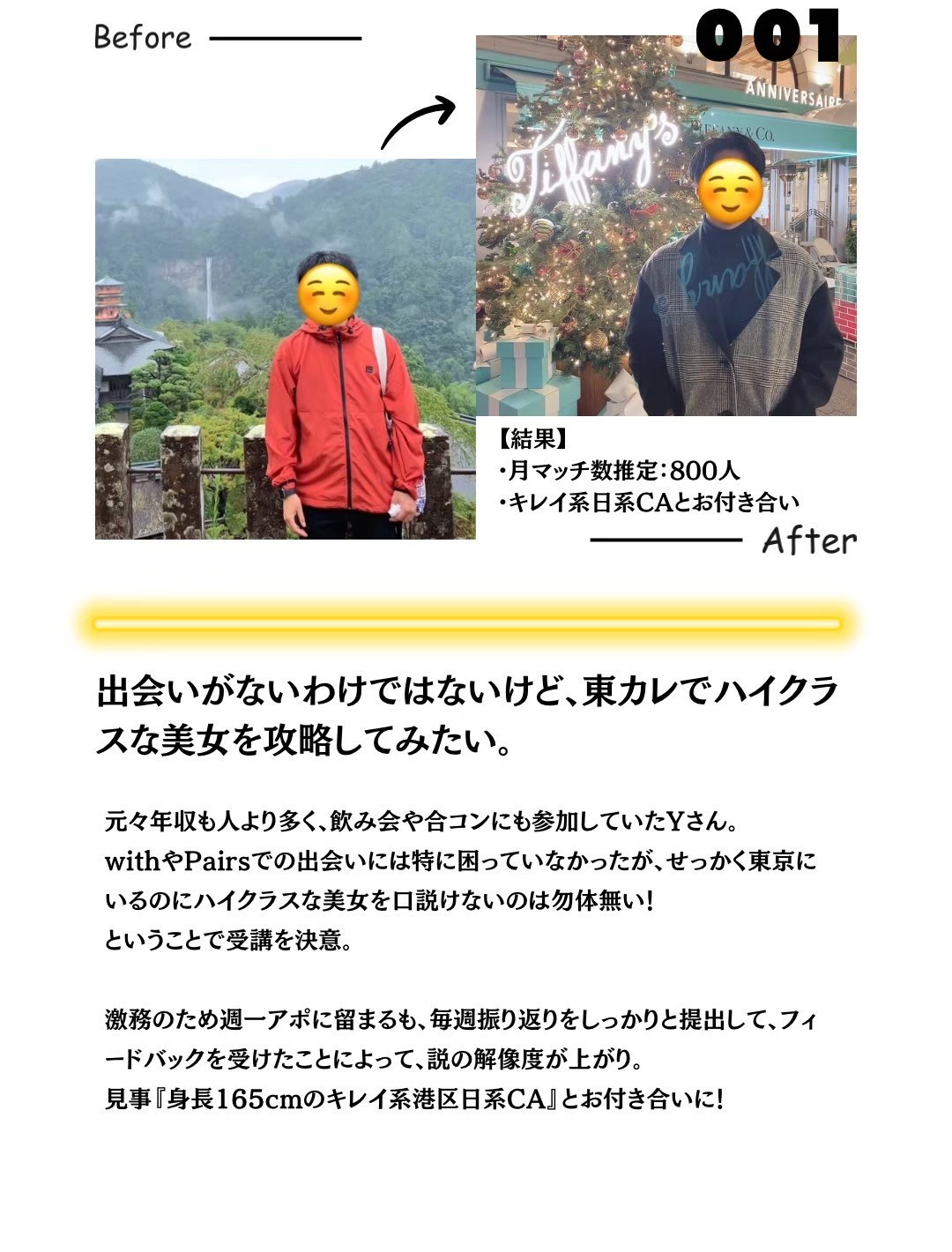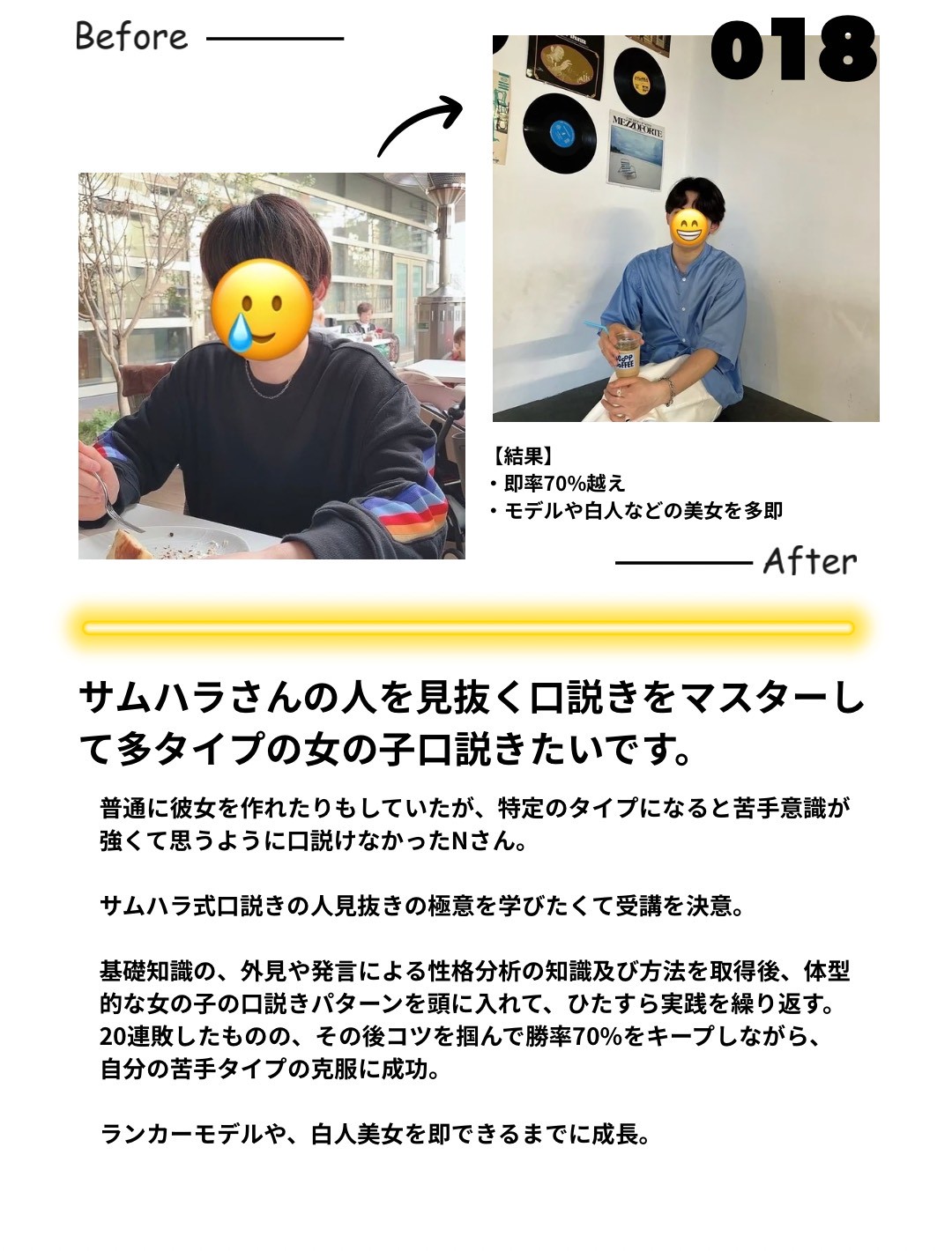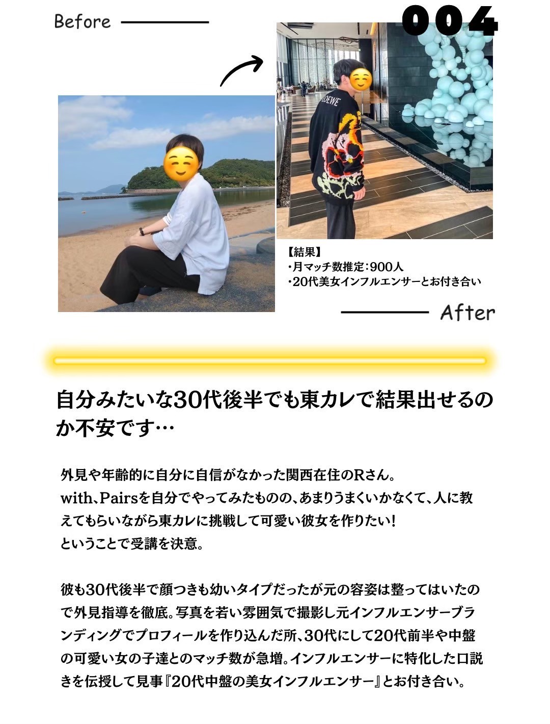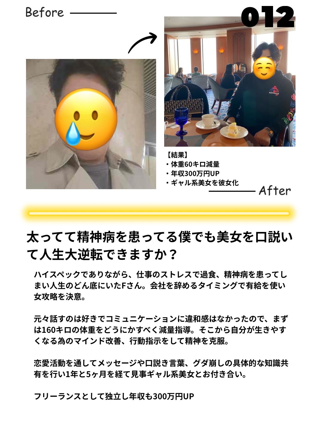 話しすぎるくせについては、割と必要ない言葉で会話の隙間を埋めようとする癖があったので、心の内側から来ている問題だと推定。その根源を自覚させるとともに、女性を魅了するためのゴールまでに必要な会話を認識させ、それ以外の会話は必要ないと言う教育をした上で、電話にて実践練習。その振り返りを行った。最初のほうはどうしても喋りすぎていたため、電話アポにてとある方法を試したところ、自発的に会話の間を埋めようとする行動自体が少なくなり、落ち着きのあるノンバーバルに変化していった。